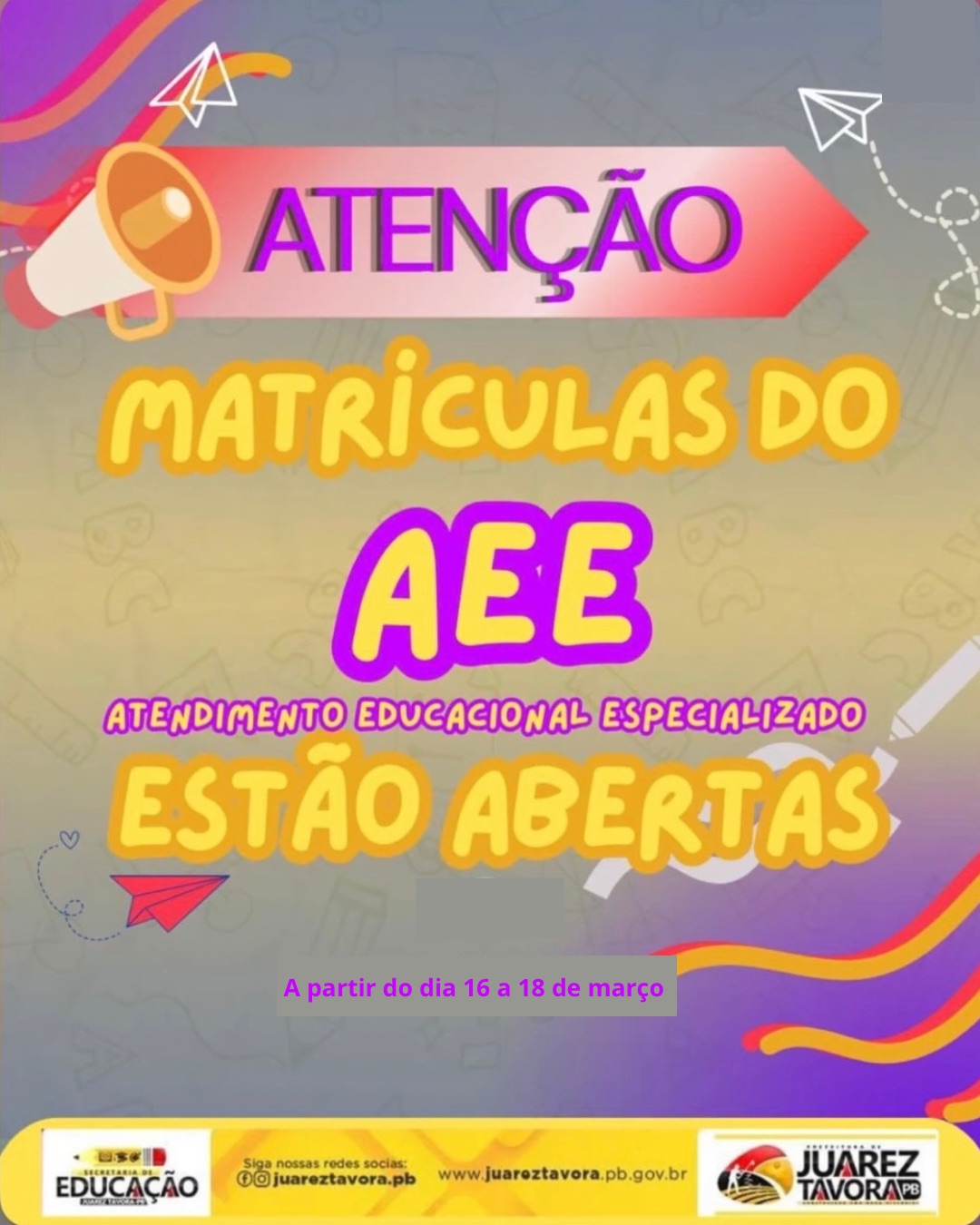A Prefeitura Municipal, por meio da Secretaria de Educação, informa que estão abertas as matrículas para o Atendimento Educacional Especializado (AEE). O período de matrícula acontece de 16 a 18 de março, com atendimento nos turnos da manhã e tarde, de acordo com o público atendido em cada unidade escolar.
